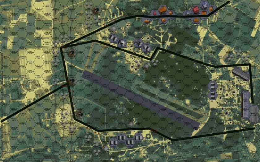 This is the airport near the town of Carpiquet, which you can see a little of in the upper section of the map. This was the site of a battle in July of 1944.