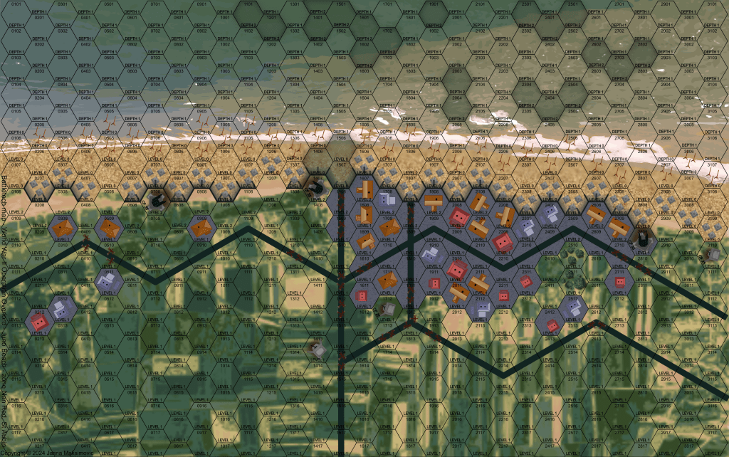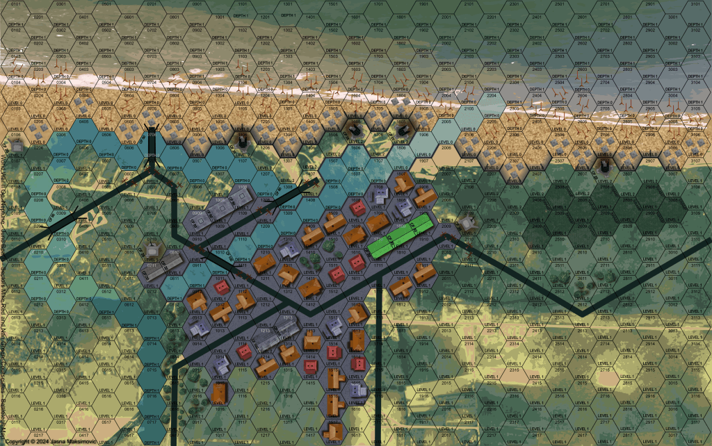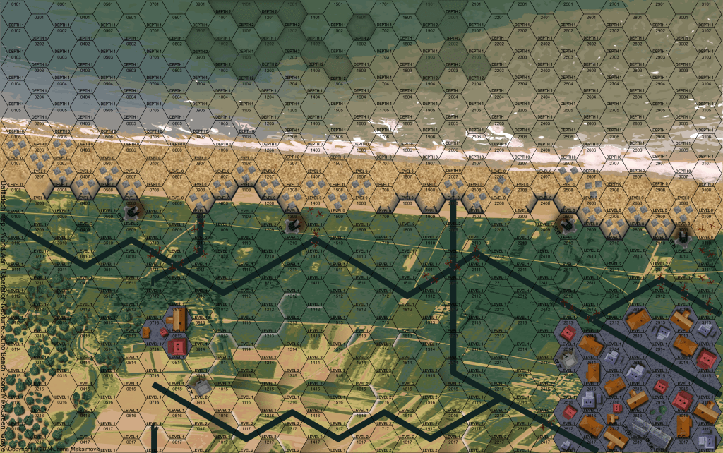 I used aerial photography as a foundation for the background images of the sea and land, then layered additional visual elements on top to communicate various game-related points of interest like roads, built up areas, areas of tree cover and movement obstacles like dragon’s teeth and Rommel’s asparagus along the beach.
